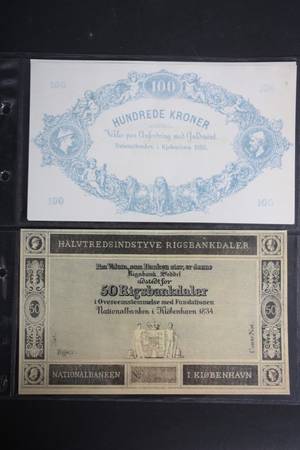 Stor samling sedler, reklamesedler, kopisedler m.m. En del trykt som bilag til nationalbankens historie 1878-1908. Mange Danske. Ca 275 stk, næsten alle forskellige. Langt hovedparten Läs mer...