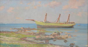 Kustlandskap med båt. A tergo stämpelsignerad. 34x62 cm.