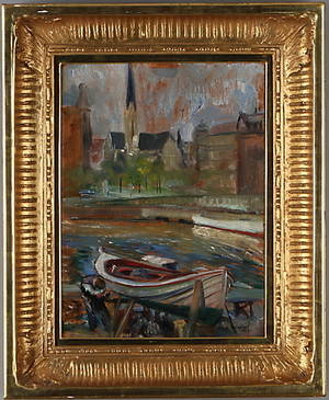 AXEL WALLERT. Stadsmotiv med båt, olja på pannå, signerad daterad 1934.