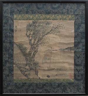 Tuschteckning, 1800/1900-tal, Japan. Uppklistrad på siden. Man i båt. 44 x 41.