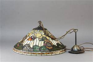 Pendel i tiffanystil med skærm af blyindfattet akryl. Ø 52 cm. Fremstår med brugsspor.
