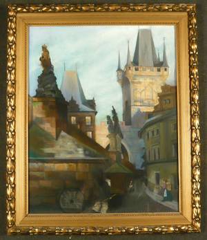 Unbekannter Künstler (19. /20. Jh), 'Prag', Pastellkreide auf Papier, gerahmt, hinter Glas, undeutlich bezeichnet 'O Nejedly'. Rahmen etwas bestoßen und ausgebessert. H. 61cm, B. 48cm (Maße ohne Rahmen). JH Transport kann diese Ware zum JH-Lager in Ishøj für DKK 300,- + dänische MwSt. oder zu jeder Adresse in Dänemark zu dänischen Inlandspreisen transportieren.