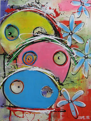 Saline. Figurkomposition, Happiness is not about getting what we want...its about appreciating what we have, akryl på lærred. Sign. Saline. 100 x 100 cm. Läs mer...