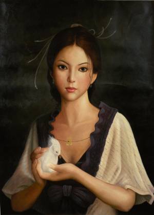 Okänd konstnär, 2000-talet. 'Flicka med fågel'. Olja på duk. Dukmått: ca 170x130cm. Ej uppspänd, utlämnas rullad, rullat mått: L. ca 130 cm. Diam: ca 10 cm.