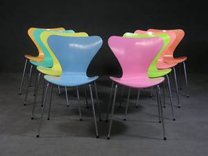Arne Jacobsen, 8 Stapelstühle Modell 3107, für Fritz Hansen. Aus formgebogenem Schichtholz in verschiedenen Pastellfarben lackiert, Gestell aus verchromtem Stahlrohr mit schwarzen Kunststoffschuhen. Unter der Sitzschale mit Herstellerlabel 'Fritz Hansen 1989'. Stärkere Gebrauchsspuren, Kantenbestoßung der Lackierung und Kratzer, stellenweise kleine Mängel am Chrom. SH 47 cm (8) JH Transport kann diese Ware zu den JH- Lagern in Odense oder Ishøj, Dänemark, für DKK 300 + dänische MwSt., oder zu dänischen Inlandspreisen zu jeder Adresse in Dänemark transportieren.