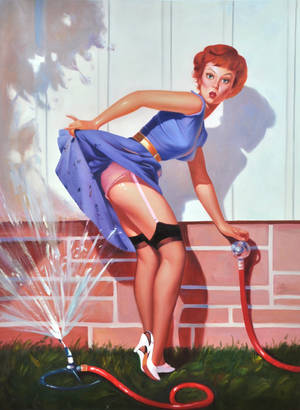 Okänd konstnär, 'Kvinna och vattenspridare'. Olja på duk, 2000-tal. Osignerad. Dukmått ca 175 x 123 cm. Ej uppspänd, utlämnas rullad, rullat mått: L. ca 123 cm. Diam: ca 7 cm.
