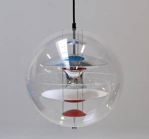 Verner Panton. Pendel med bemalede aluminiumsskærme monteret i kugle af transparent akryl. Formgivet 1969. Fremstillet hos Verpan, model VP-Globe Ø 40 cm. Fremstår med et løst samlestykke (kan pålimes) (se foto). Litteratur: Verner Panton The collected Works, gengivet og omtalt s. 290.