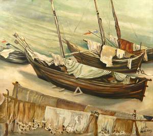 Herm Dienz, 'Fischerboote am Strand', Öl auf Leinwand, gerahmt. Unten rechts signiert und datiert '36'. H 60cm, B 69cm (Maße ohne Rahmen). JH Transport kann diese Ware zu JHs Lagern in Odense oder Ishøj, Dänemark, für DKK 300 + dänische MwSt., oder zu dänischen Inlandspreisen zu jeder Adresse in Dänemark transportieren.