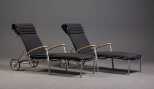 Par solvogne i sort polyrattan med stel af silver pulverlakeret aluminium. L 195. B 65 cm. Monteret med koksgrå hynder i polyakryl. Leveres i emballage.(2)