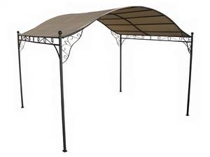Havepavillon i metal og lærred. Pulverlakeret metalstel med 4 hjørnestolper, buet top, ornamenter og montérbart lærredstag. H. 260 cm (midtermål), b.360 x 300 cm. Leveres i usamlet i kasse mål; H15, B34,L212 cm