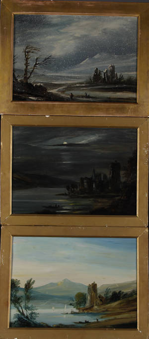 Ubekendt kunstner: Tre landskaber med borgruin. Usign. Olie på metal. Hver 25 x 35 cm (30 x 40 cm).