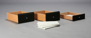 Peter J. Larsen/Montana. Tre løse skuffer med sortlakeret front samt fire løse hylder af hvidlakeret træ. B. 33 D. 18, B. 43 D. 32 cm. Fremstår med med små afslag på skuffer, en med lille tryk. (7)