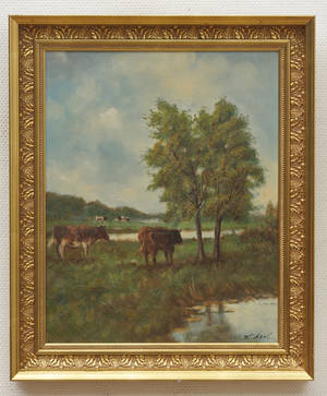 W. Apell, olie på lærred. Landskab med græssende køer, træer og vand. Signeret. H. 49 x 40 cm (60 x 50 cm)