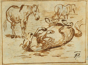 Theodor Philipsen. Hestestudie, tusch på papir, sign. monogram TP. 8,4 x 10,5 cm. Proveniens: Kunsthallen, auktion nr. 473. Nr. 16928.