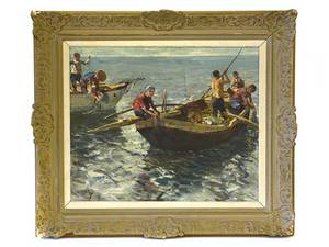 Oljemålning, Oidentifierad konstnär. Båtar i ka...