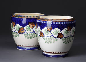 Aluminia urtepotteskjuler nr. 727/605 med klassisk dekoration i form af blomster og blade. Signeret i bunden. Fremstår med nogle krakkeleringer. En med lille glasafslag på kant. Højde 21 cm. (2)