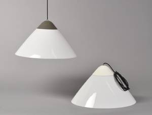 Hans J. Wegner. Par Opala pendler af hvidt plast. Fremstillet hos Louis Poulsen. Ø. 51 cm. Top af senere hvid lakeret aluminium. Fremstår med brugsspor Läs mer...