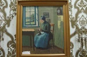 Interiör med stickande kvinna. Monogramsignerad FAKG (?). Olja på duk. 58x49 cm. Proveniens Kastberga slott