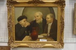 Tre män i samtal. Signerad Bidis. Olja på duk. 1900-talets andra hälft. 49 x 60 cm