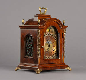 Lygteur med kasse af nøddetræ, urværk af messing, urskive af tin med romer- og arabertal, flankeret af gennembrudte monteringer af forgyldt messing, rigt støbt med Läs mer...