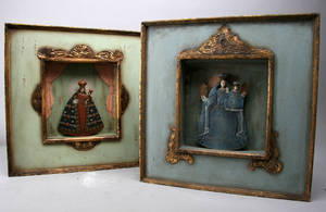 Billeder i relief med ikoner,udført i træ og metal med bladguld og patineret bemaling. Rammer i pastelgrøn og blå. Mål 40 x 40 x 5,5 cm. (2)