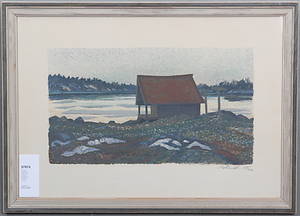 Avslutade auktioner liknande ROLAND SVENSSON. Färglitografi, "stuga vid skärgården", signerat och numrerat 157/310.