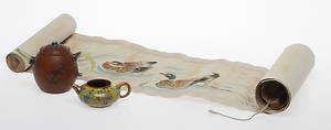 Kannorna höjd 4,3-11 cm. Rulmålning med motiv av fåglar. Rullmålningens längd ca 345 cm.