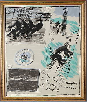 Gösta Werner (1909-1989), Sverige. En sjöman berättar. Signerad, färglitografi, numrerad 25/40,41x49 cm, yttermått inklusive ram: 60x69 cm. Gösta Werner, svensk målare, tecknare, grafiker och skulptör Läs mer...