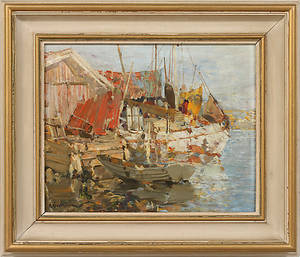 Hugo Öfverström (1900-1973), Sverige. Fiskeläge. Signerad. Olja på duk, 65x76, yttermått inklusive ram: 81x92 cm. Hugo Öfverström, svensk målare född i Kungälv 1900, död 1973. Läs mer...