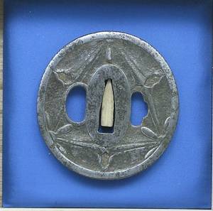 Rund tsuba av järn med genombruten bladdekor. Diameter 7 cm. Åldersrelaterat slitage. Borrade hål i kanten. Läs mer...