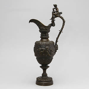 I form av vinkanna , med dekor av puttis och vinrankor. Höjd 58 cm.