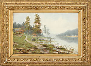 Thorsten Waenerberg, Sjölandskap. Signerad Th.W och daterad 22.7.1900. Olja på duk 24 x 37 cm. Åldersrelaterat slitage. Läs mer...