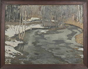 "RAGNAR NYBERG. Vårvinter vid vattendrag. Olja på duk. Signerad och daterad 1912."