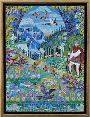 Esben Hanefelt Kristensen. Den hellige Veronikas svededug kapitel II, billede 1. Akryl på plade. Sign. samt dateret bagpå Esben Hanefelt Kristensen, 2010. 40 x 30 cm (42 x 32 cm). Værket er en del af samlingen af illustrationer til Selma Lagerlöfs Kristuslegender. Hele samlingen kommer løbende på auktion hos Lauritz.com Odense de næste måneder. Kristuslegender er lige udkommet i en ny udgave her i 2011 med illustrationer af Esben Hanefelt Kristensen, og har fået meget fin kritik i fx. Politiken. Aalborgkunstneren Esben Hanefelt Kristensens navn slog sig for alvor fast i danskernes bevidsthed med illustrationerne til "Billedbibelen", udgivet først i 90´erne. Den blev en succes hos både børn og voksne og er også udgivet på mange andre sprog. Esben Hanefelt Kristensen?s billeder er fortællende og farvestærke. Han har valgt at udtrykke sig i et detaljeret formsprog. Mennesker og dyr, blomster og træer danner fint tegnede mønstervirkninger over lærredet, og samtidig er der - næ