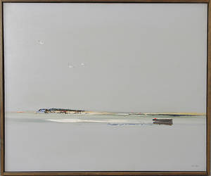 Avslutade auktioner liknande OIDENTIFIERAD KONSTNÄR. Kustlandskap med båt och fåglar, olja på duk.