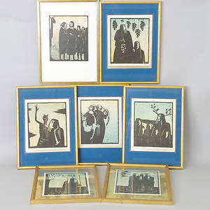 Linoleumsnitt, sju st. Bibliska motiv. Dagmått ca 21x18 cm. Ej examinerade ur ram. Fläckar. Läs mer...