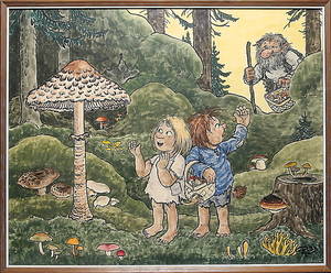 Offsettryck med motiv av troll. Teckning i tusch på baksidan. Signerad: R.L samt Rolf Lidberg Daterad: 1984 Mått på bildyta: 35 x 25 cm Mått Läs mer...