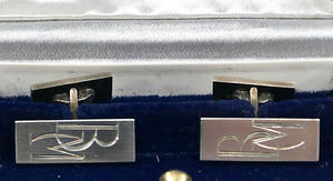 Wiwen Nilsson, manschettknappar och skjortknappar, silver Med monogram. Lund 1964. Mått ca 8 x 22 mm. och ca 10 x 5 mm. Totalvikt 14 gram. Läs mer...
