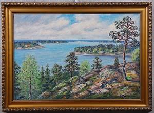 Oidentifierad konstnär. Skärgårdsvy. Bär påskrift a tergo. Olja på pannå, 35x27 cm, yttermått inklusive ram: 44x36 cm. Läs mer...