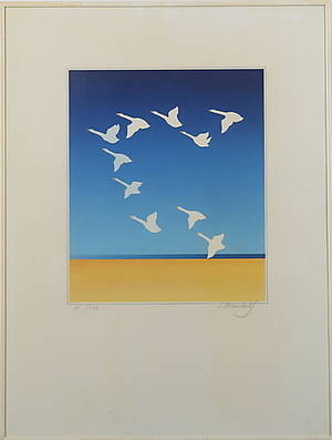 Avslutade auktioner liknande ÅKE ARENHILL. Streck med gäss, färglitografi, signerad a arenhill och numrerad 81/300.