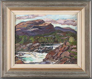 ERIK OSSLUND (1913-1982): "När det våras ibland fjällen", signerad och daterad Erik Osslund 1948, olja på pannå, ca 37,5x46 cm. Hål längs kanterna. Läs mer...