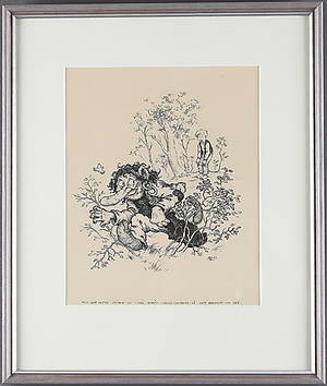 Offsettryck med motiv av troll. Teckning i tusch på baksidan. Signerad: R.L samt Rolf Lidberg Daterad: 1984 Mått på bildyta: 35 x 25 cm Mått Läs mer...