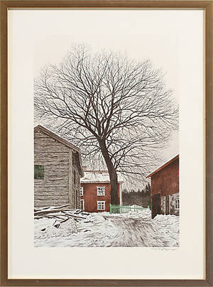Avslutade auktioner liknande REINHOLD LJUNGGREN. Vinterbild på gård, färglitografi, signerad och numrerad 86/310.
