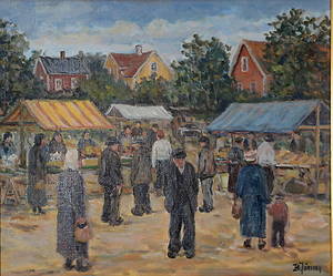 Bror Jönsson (f. 1931), Sverige. Handelsbod. Signerad. Olja på duk, 22x26, yttermått inklusive ram: 33x37 cm. Bror Jönsson, svensk målare och tecknare född 1931. Läs mer...