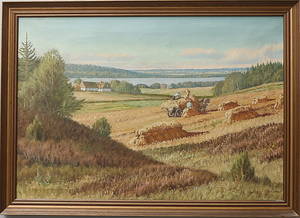 Oidentifierad konstnär. Landskap med kor, ej signerad. Olja på duk, 43x63 cm, yttermått inklusive ram: 62x83 cm. Läs mer...
