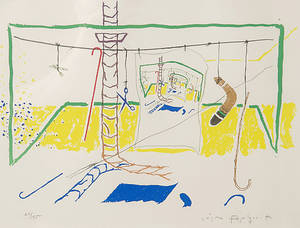 Färglitografi, 199/350. Signerad. Komposition med stege. Dagmått 50x37 cm. Ej examinerad ur ram. Läs mer...