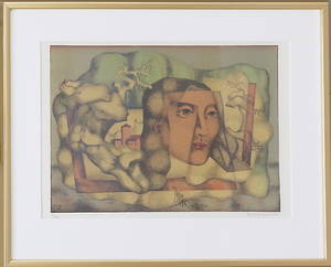 ERIK OLSON (1901-1986): Surrealistisk komposition med kvinnoansikte, signerad och daterad Erik Olson 1974, numrerad 259/260, färglitografi, dagermått ca 36x48 cm. 625483. Läs mer...