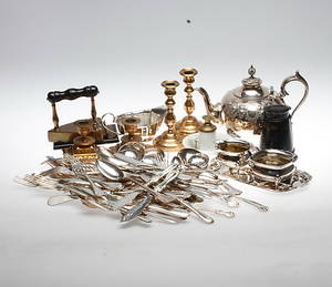 Metallföremål koppar och nysilver, bl.a. ljusstakar, kaffepanna formar mm Läs mer...