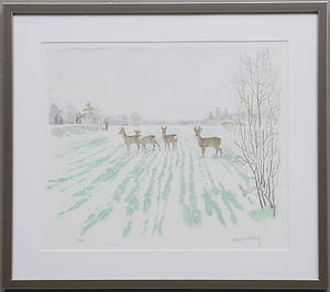 HARALD WIBERG (1908-1986): Rådjur i vinterlandskap, signerad 1979, blandteknik på papper, ca 25x35 cm. 761795. Läs mer...