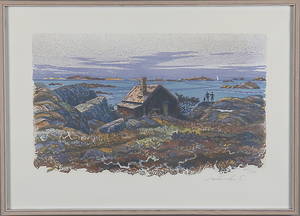 Roland Svensson (1910-2003), Sverige. Från storskärgårn. Signerad, färglitografi, numrerad 180/250. Bildmått: 24x20 cm, yttermått inklusive ram: 42x36 cm. Roland Svensson, född 1910 i Stockholm, död Läs mer...